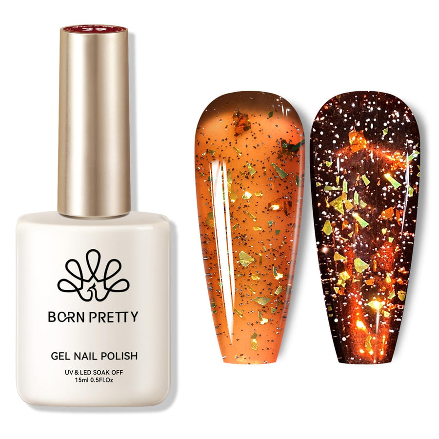 Born Pretty Jelly Nail Polish, Orange Glitter Sheer Transparent Crystal Gel Polish, Fall Winter Translucent Clear Gel Polish Manicure Gift for Women 15ML