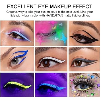 - 【12PCS MATTE EYELINER】12 colors rainbow colorful liquid eyeliners are ideal for party, cosmetic show, daily makeup, Unlike the most eyeliners, this eyeliners also glow under UV. You could create colorfully vibrant and fun looks from day to night.