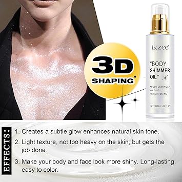 - SHIMMERING BODY GLOWING LUMINIZER -- This shimmer body oil brightens your complexion, the flecks of shimmer catch the light and make your skin glow, giving your skin an attractive shimmer in the sun, giving you a more natural and healthier complexion.