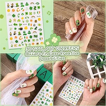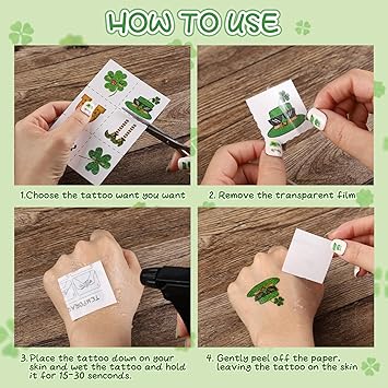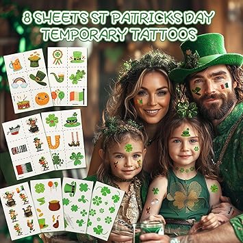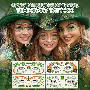 • COMPLETE ST PATRICKS DAY MAKEOVER KIT:Transform your Saint Patricks Day look with a comprehensive 14-piece kit featuring 12 versatile temporary tattoo sheets for face and body, a dynamic 3D nail art sticker, and vibrant green body glitter. An essential collection of tattoo accessories and supplies, it even includes charming shamrock stickers to perfectly capture the holiday spirit.