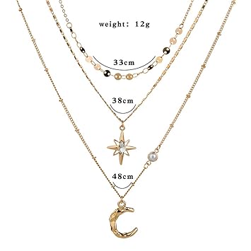 Boho Simple Gold Moon and Star Sequins Layered Necklace Dainty Pearls Chain Pendant Long Necklaces Jewelry for Women
