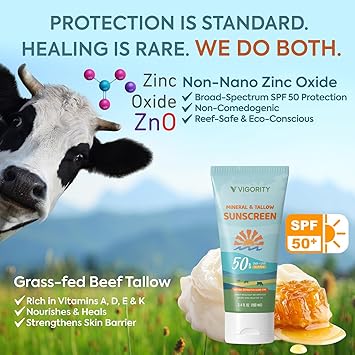 Beef Tallow Sunscreen with Zinc Oxide: Natural Non-Toxic SPF 50 Sunblock Cream for Face & Body - 10 Food-Grade Botanical Extracts Kids Sensitive Skin Safe, Water-Resistant 3.4 FL OZ