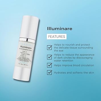 • Welcome Transformation: Revel in the soothing sensation as Illuminare's rich yet lightweight texture glides effortlessly onto your skin, instantly hydrating and comforting the entire eye area. With continued use, notice how it beautifully transforms fine lines, wrinkles, puffiness, and dark circles, revealing a radiant and refreshed appearance. Let this blend illuminate your path to timeless beauty, restoring luminosity to your eyes with each application.