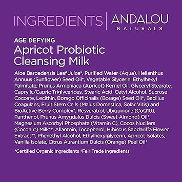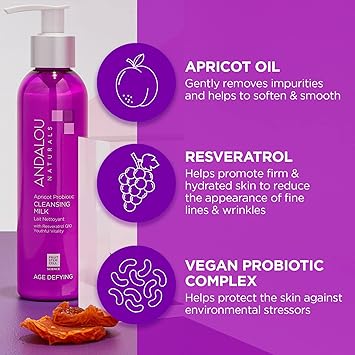 Andalou Naturals Probiotic Cleansing Milk, Apricot Facial Cleanser for Dry, Dehydrated Skin, Gentle Makeup Remover, Hydrating Anti Aging Face Wash, Cruelty Free, 6 Fl Oz