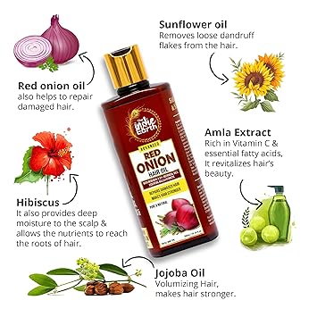 • 'How can this oil help in controlling hair fall? Answer: This oil combines Redensyl, Red Onion, and a blend of natural oils like Neem, Black Seed, and Tea Tree to strengthen hair roots, nourish the scalp, and reduce breakage. Redensyl revitalizes hair follicles, while Red Onion’s sulfur content fortifies hair strands. Properties of Neem and Tea Tree oils maintain scalp health, minimizing hair fall caused.'