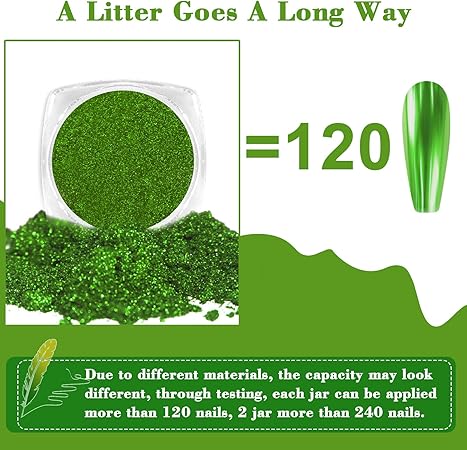 - Package Content: You will receive products including 2 jars of metallic green chrome nail powder and 2 eyeshadow sticks. Net content 1g(0.4oz)/jar, it can be applied for 120 nails and more. Just a little nail pigment powder to get an amazing metallic mirror effect.