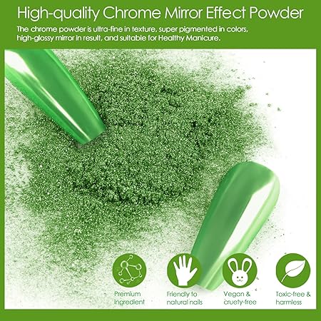 - Ultra Excellent Texture: The green chrome nail powder is fine and smooth without particles feeling, so you can make your st patrick's day nails exquisite with an amazing mirror effect. And the nail dipping powder is non-toxic, more durable, and environmentally friendly, which does not harm your nails and skin, using it more at ease. Make mirror effects for your nails with our excellent equality nail chrome powder set.