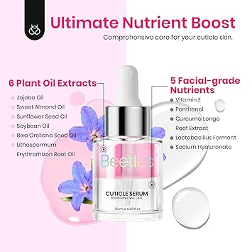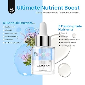- Natural Ingredients: Nutritious & Healthy Nail CareBeetles cuticle oil contains real natural nutrient ingredients ( Jojoba Oil、Olive Oil、Vitamin E) that moisturize the cuticles and strengthen the nails.