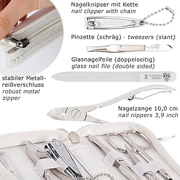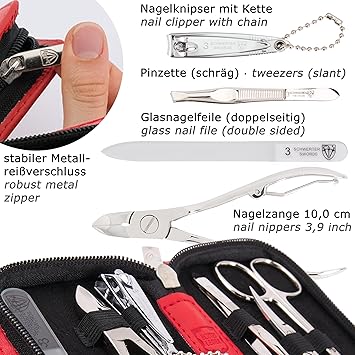 • STEEL IMPLEMENTS: Hand made, bright nickel plated (protection against corrosion), polished and hardened. All sets come in an attractive gift box. Instruments are made in Solingen / Germany (except nail clipper).
