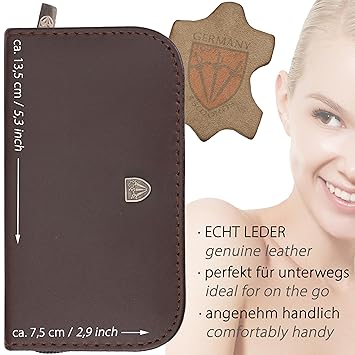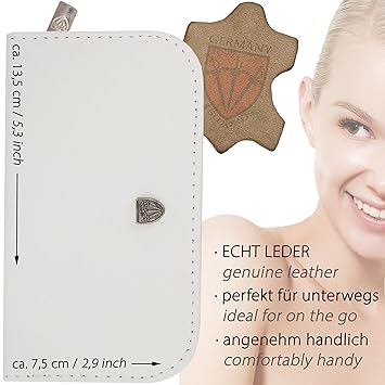 • CASE: Genuine leather white, size ca. 14,0 x 8,0 x 3,0 cm. Our organizers are made of high-grade fashion or classic materials. Additional equipment: Microfiber cleaning cloth for cleaning steel items, general info sheet “Finger - Nail Grooming”.