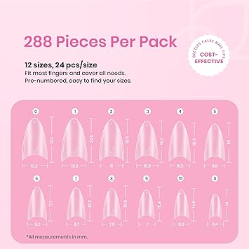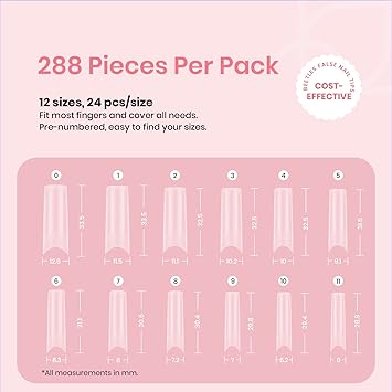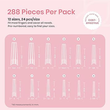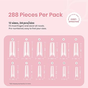 - 【12 Sizes Half Cover Nail Tips】:This 288 PCS false nail tips set comes in 12 sizes for effortless matching to each finger. Each nail tip in the transparent series features a thinner edge to fit your natural nails. Beetles half cover nail tips offer a more natural appearance, resembling nails that have grown out naturally.
