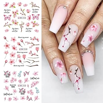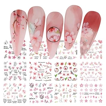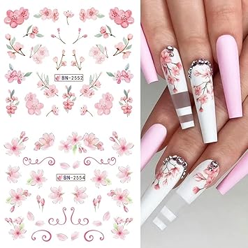 12Pcs Pink Flower Nail Art Stickers Decals Cute Cherry Blossom Supplies Watercolor Floral Water Transfer Design Spring Summer for Women DIY Manicure Decorations Accessories