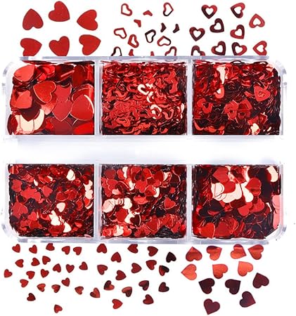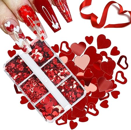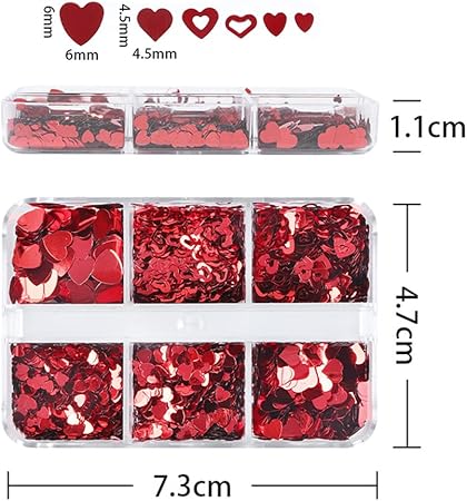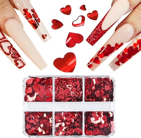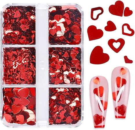 6 Grids Heart Nail Glitter Sequins Premium 3D Art Stickers Love Decals Holographic Laser Designs for Valentine's Day DIY Acrylic Decoration