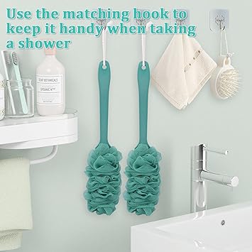 - 【Coordination Set】2 pcs green back scrubber, each with a hook for easy hanging on the wall. Each back scrubber have rope loops that can be hung. With our hooks, they can be hung on the bathroom wall at will, keep dry.