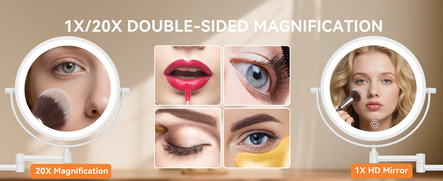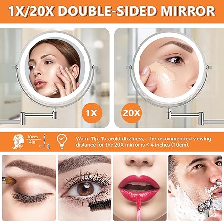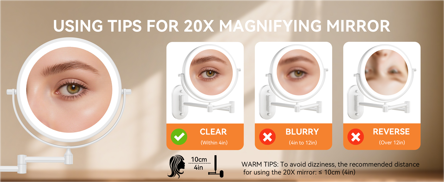 - ๐ด ๐๐ป๐ฐ๐ต ๐ญ๐ซ/๐ฎ๐ฌ๐ซ ๐๐ผ๐๐ฏ๐น๐ฒ ๐ฆ๐ถ๐ฑ๐ฒ๐ฑ: From 20X magnifying side, it magnifies every detail on face. Achieve a natural look using the regular side and utilize the 20X magnification for flawless eyebrow shaping, precise eyeliner application, shaving and more. ใWARM TIPใ When you use the 20X mirror side, please get your face within 4 inch to the mirror to see clearly and avoid feeling dizzy. It is not a product defect, but rather a natural physical occurrence in concave mirrors.