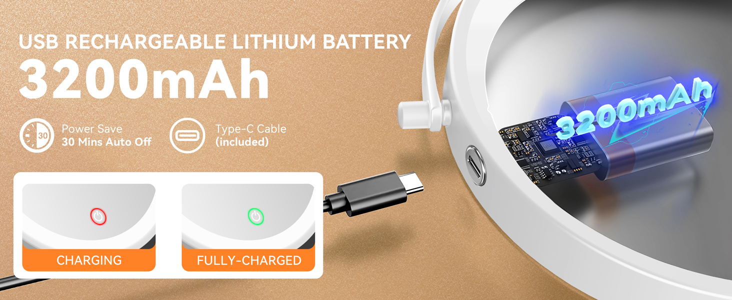 - ๐ง๐๐ฝ๐ฒ-๐ ๐ฅ๐ฒ๐ฐ๐ต๐ฎ๐ฟ๐ด๐ฒ๐ฎ๐ฏ๐น๐ฒ ๐๐ป๐ฒ๐ฟ๐ด๐ ๐ฆ๐ฎ๐๐ถ๐ป๐ด: Auxmir wall mounted makeup mirror features a rechargeable 3200 Lithium battery, Type-C cable is included. Normal full charge time is around 4 hours. Moreover, it features a power-saving design that automatically shuts off the LED light after 30 minutes of no use.