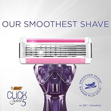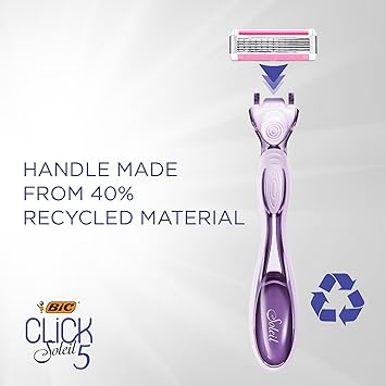Get your hands on the BIC Soleil Click 5 Women's Razor Gift Set, a clever choice for women who value simplicity and reliability. This set features a razor with five flexible blades that contour to your body, providing a close and comfortable shave. Its unique design makes it an ideal face razor for women, offering a smooth glide thanks to its Soothing Moisture Strip enriched with Aloe Vera. This women's razor set includes one handle and ten refillable cartridges, making it a practical and long-lasting solution for your shaving needs. It's not just about the function, though. The razor handle is made from 58% recycled rubber and 34% recycled plastic, proving that you can make a smart choice without sacrificing quality. This set is perfect as a gift idea for women, or a treat for yourself. So, if you're in search of reliable razors for women that offer a smooth shave and are kind to the environment, the BIC Soleil Click 5 Women's Razor Set is a brilliant option.