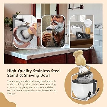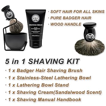 - 【Shaving Kit All in 1】 This kit includes all you need for wet shaving. One handmade shaving brush with pure badger hair bristle; one stainless-steel soap cup for creating lather; one shave cream 5 fl oz; one high quality stainless steel shaver brush stand; a handbook for first shave