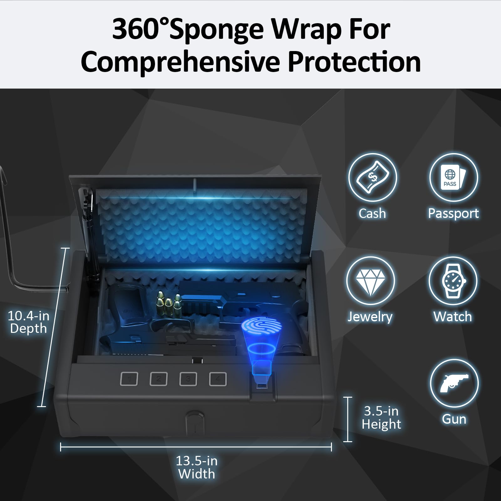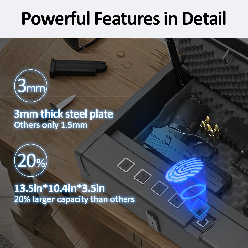 - ✅【Fingerprint+Keys+Password】Quick-access biometric gun safe is absolutely important for you and your family.3 ways to open the safe!The safe can be opened within 0.5 seconds.Fingerprint+Keys+Password provide the possibility of quickly opening a safe.Note: Do not place the key in the safe!!