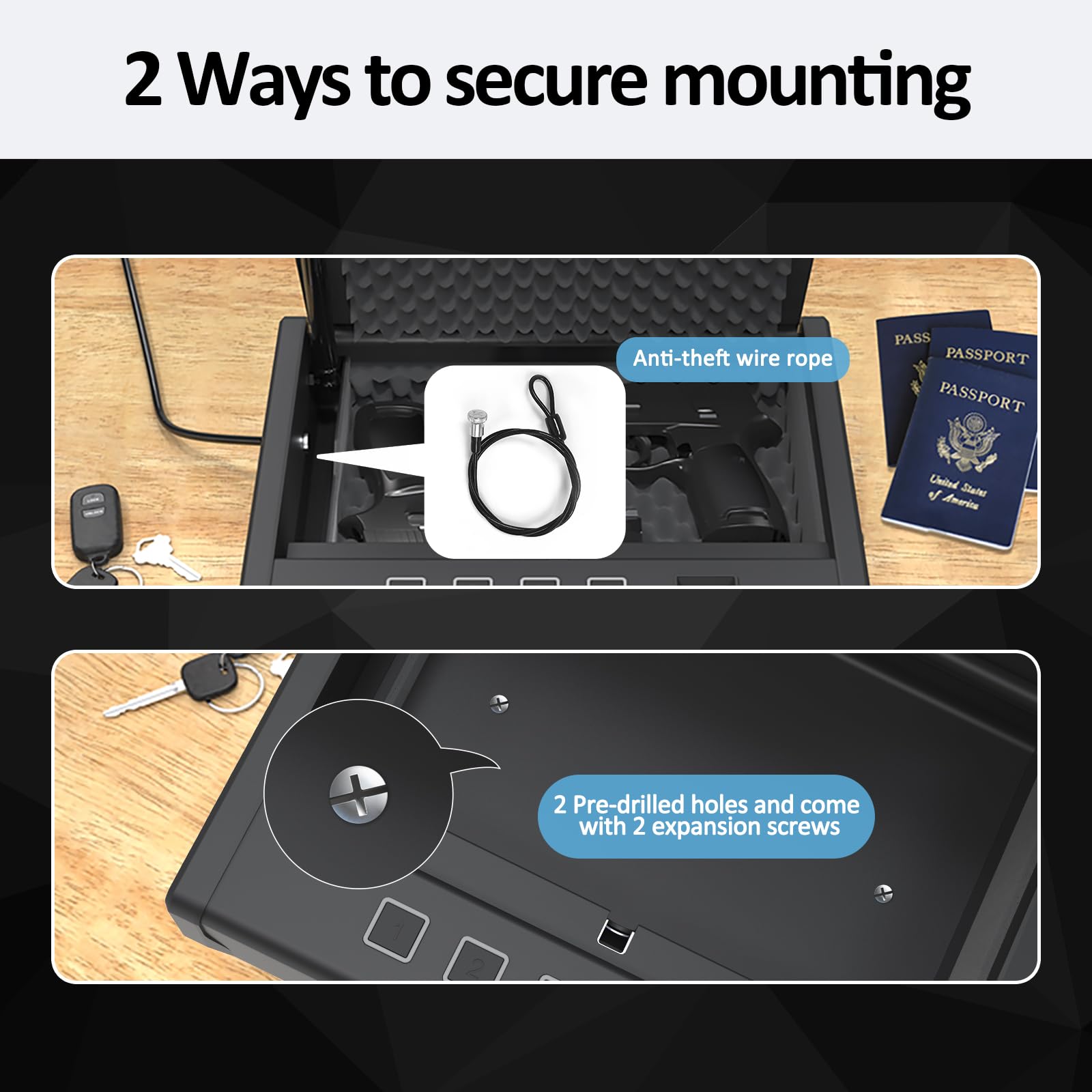 - ✅【Anti-theft wire rope】The matching Anti-theft wire rope(Contained in the safe) can fix the safe in the car, by the table, or anywhere else.