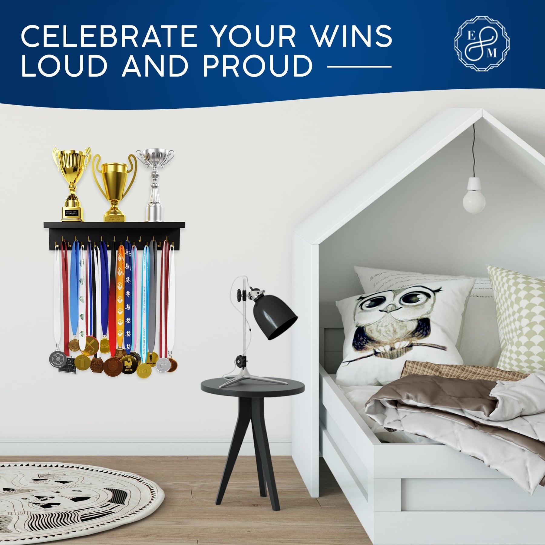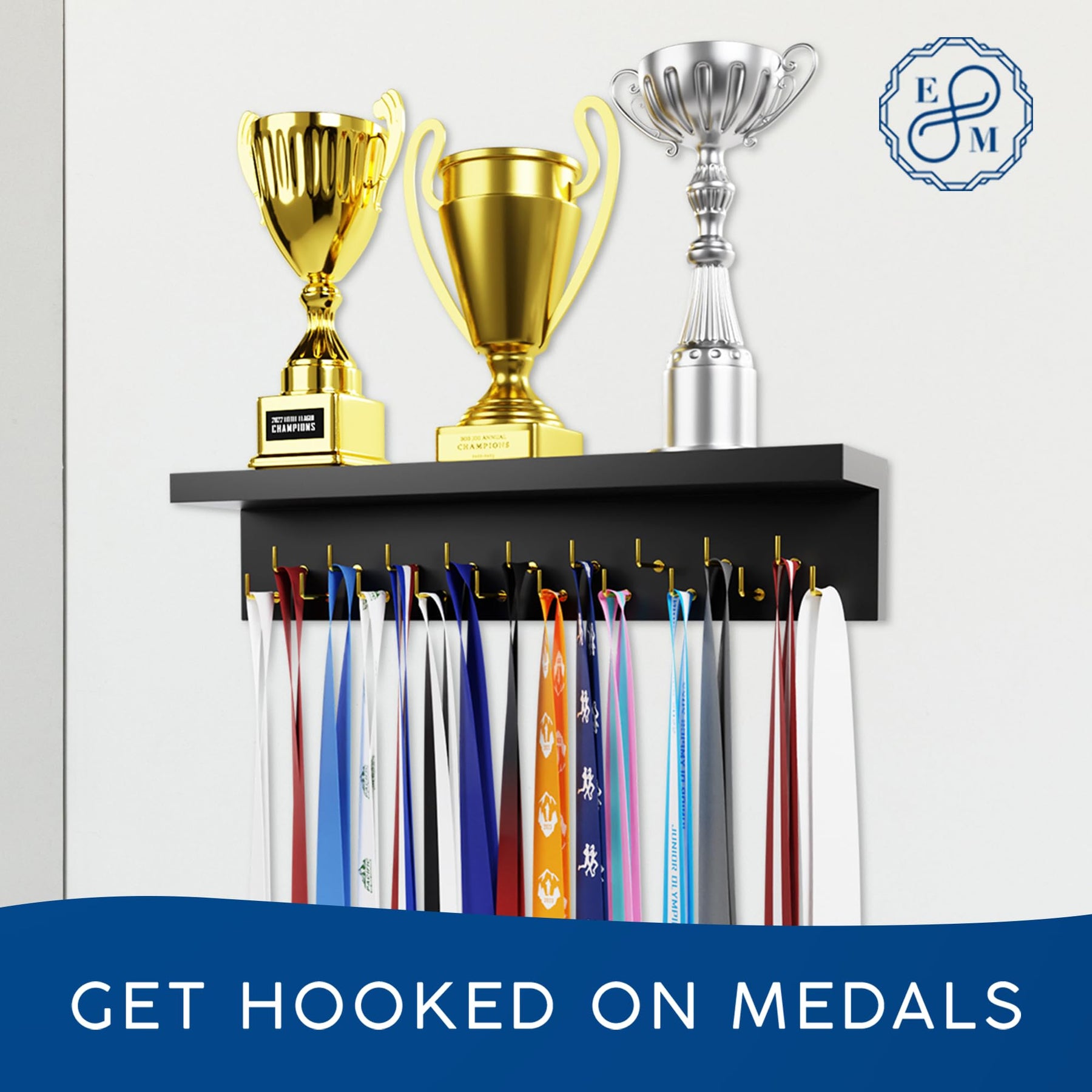 - DISPLAYS TROPHIES in full visual celebration as this medal rack is a trophy and medal display shelf. Hang 23 medals on the 23 extra-long medal hooks and show off hard-won trophies on the trophy shelf