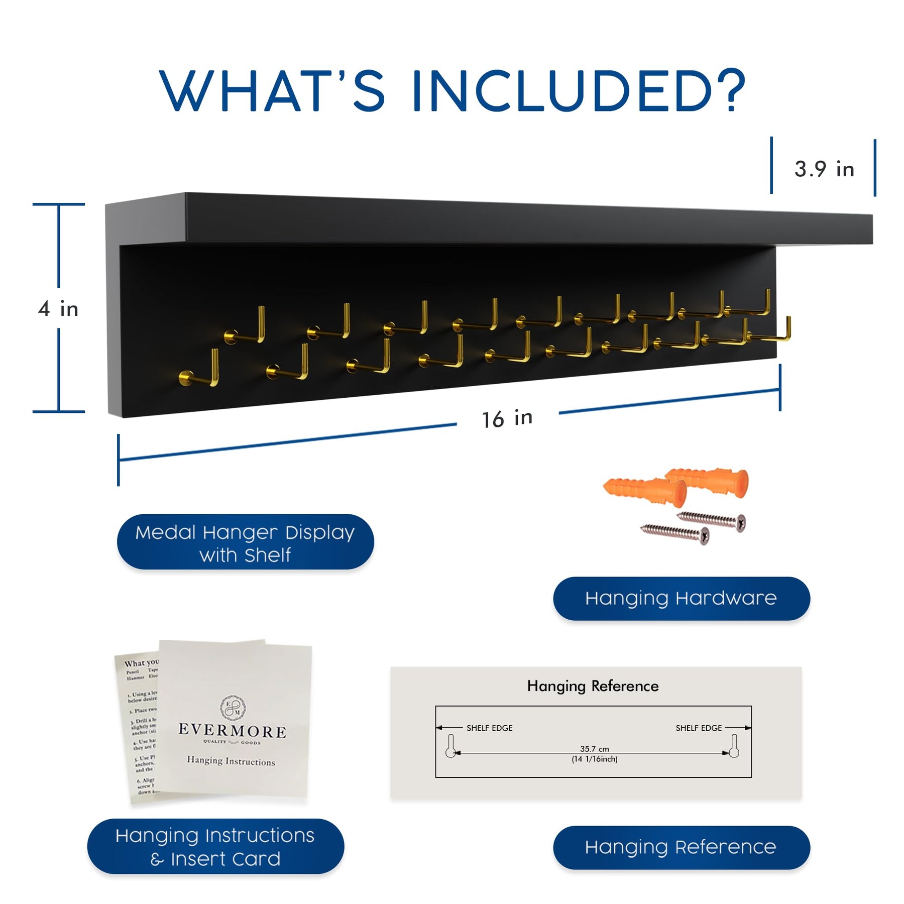 - SAVOR YOUR WINS! Evermore’s sleek, chic wooden medal hanger display with shelf level is a medal awards rack that can inspire you to crush even more achievements.