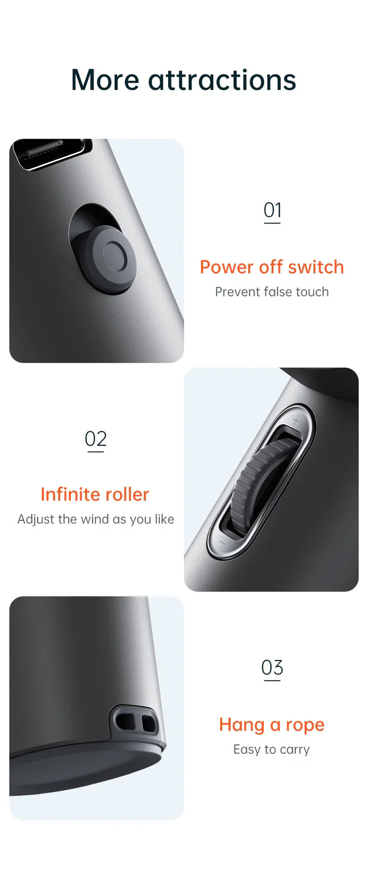 • 【Scroll Switch - Customizable Wind Speed】This small fan adopts a scroll switch design, and the wind speed can be adjusted steplessly. The portable fan can customize speeds from 1 to 100, meeting your various wind power needs in any scene.
