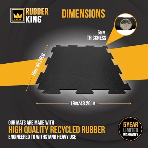 Rubber King 10 Piece Interlocking Tiles 19" x 19" x 6mm - 100% Recycled Rubber Gym Floor Tiles, Exercise Mat for Home Gym, Anti-Slip Low-Odor Interlocking Puzzle Floor Tiles - 23.5sq ft - Black