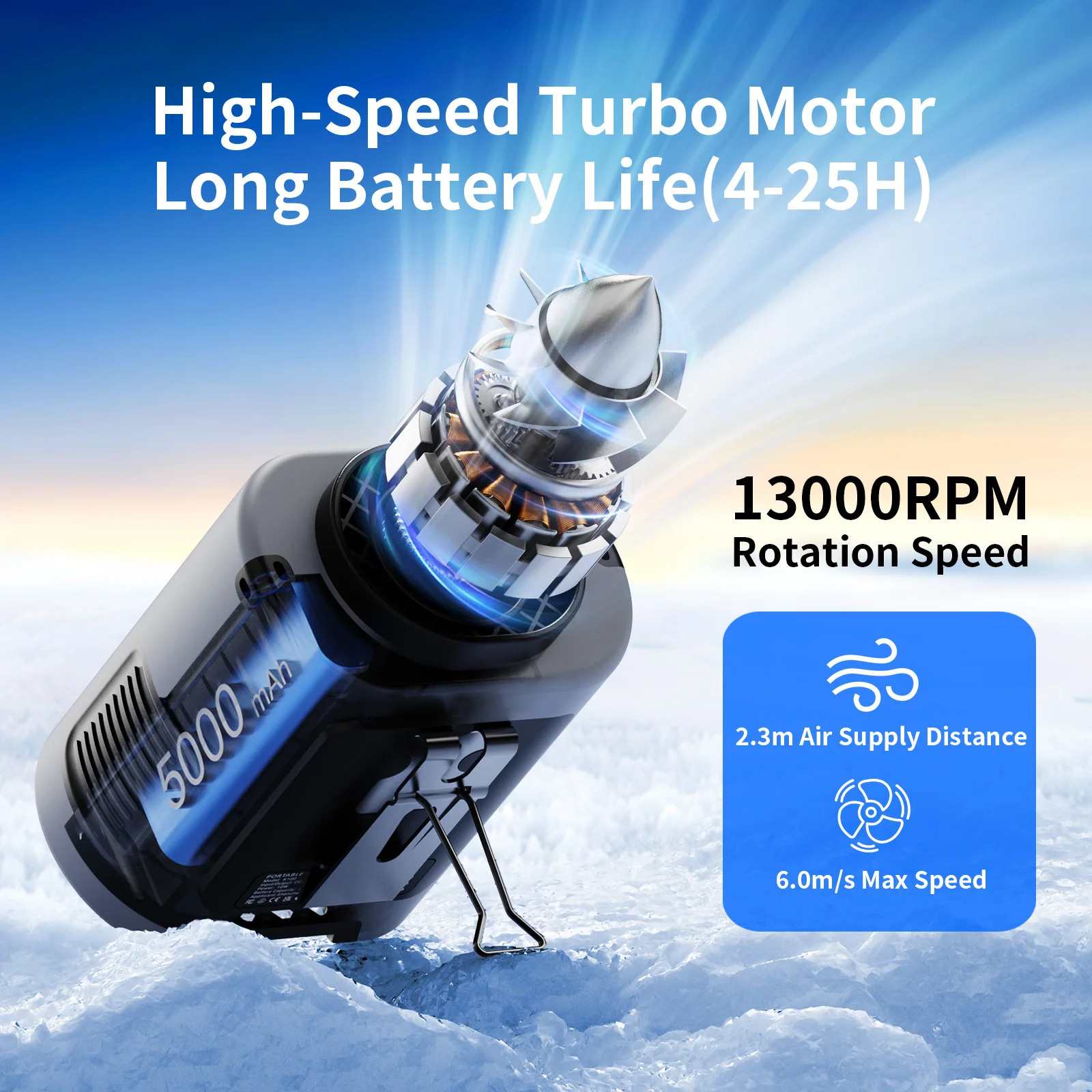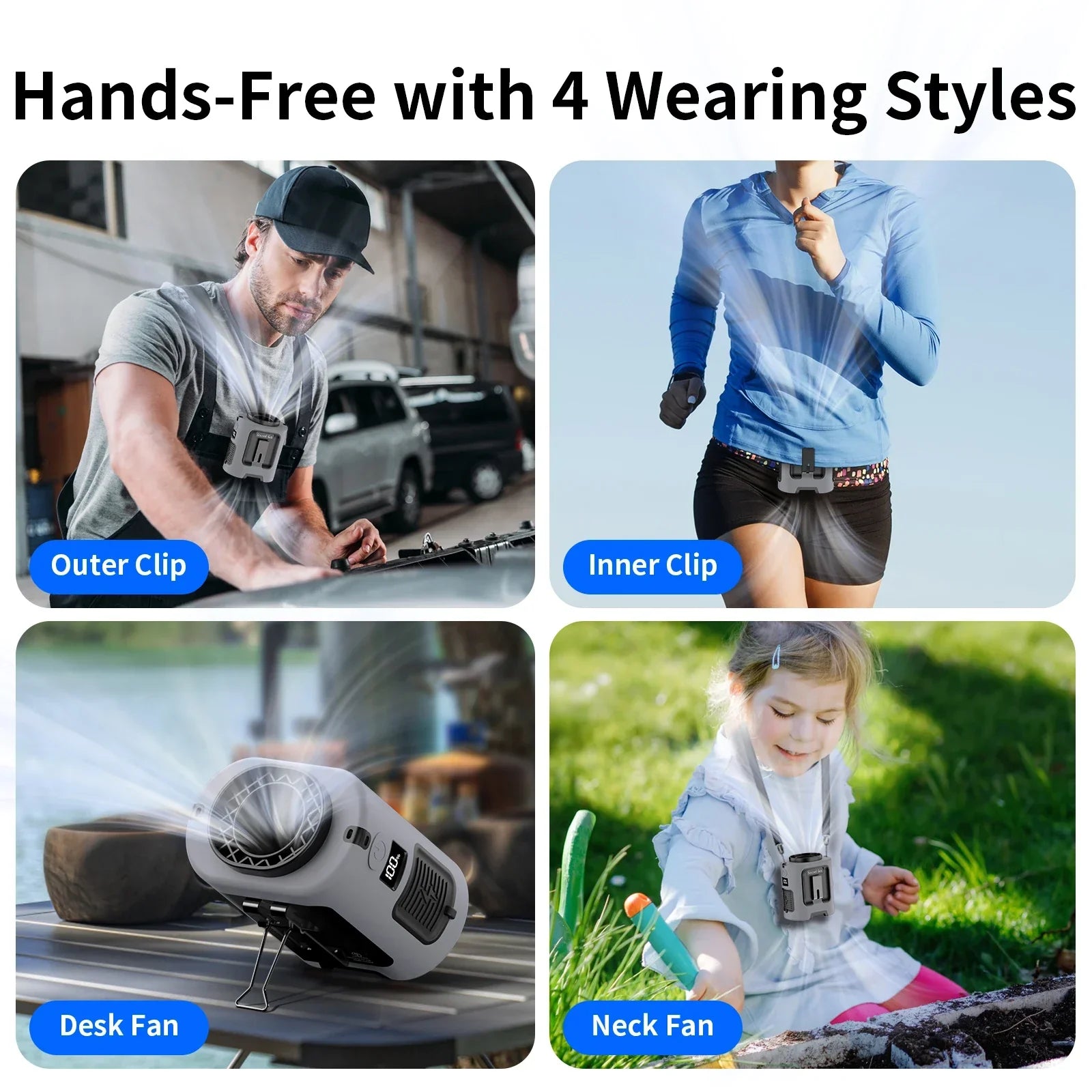 This portable waist fan is equipped with a 5000mAh rechargeable battery that can run continuously for up to 25 hours at low speed. An integrated waist clip fan, desk table fan, handheld fan, and neck fan. Clip the fan onto your shirts, belts, and pants, or hang the personal fan around your neck with the lanyard. Prop it up on a table with a kickstand on the body fan, keeping hands completely free.