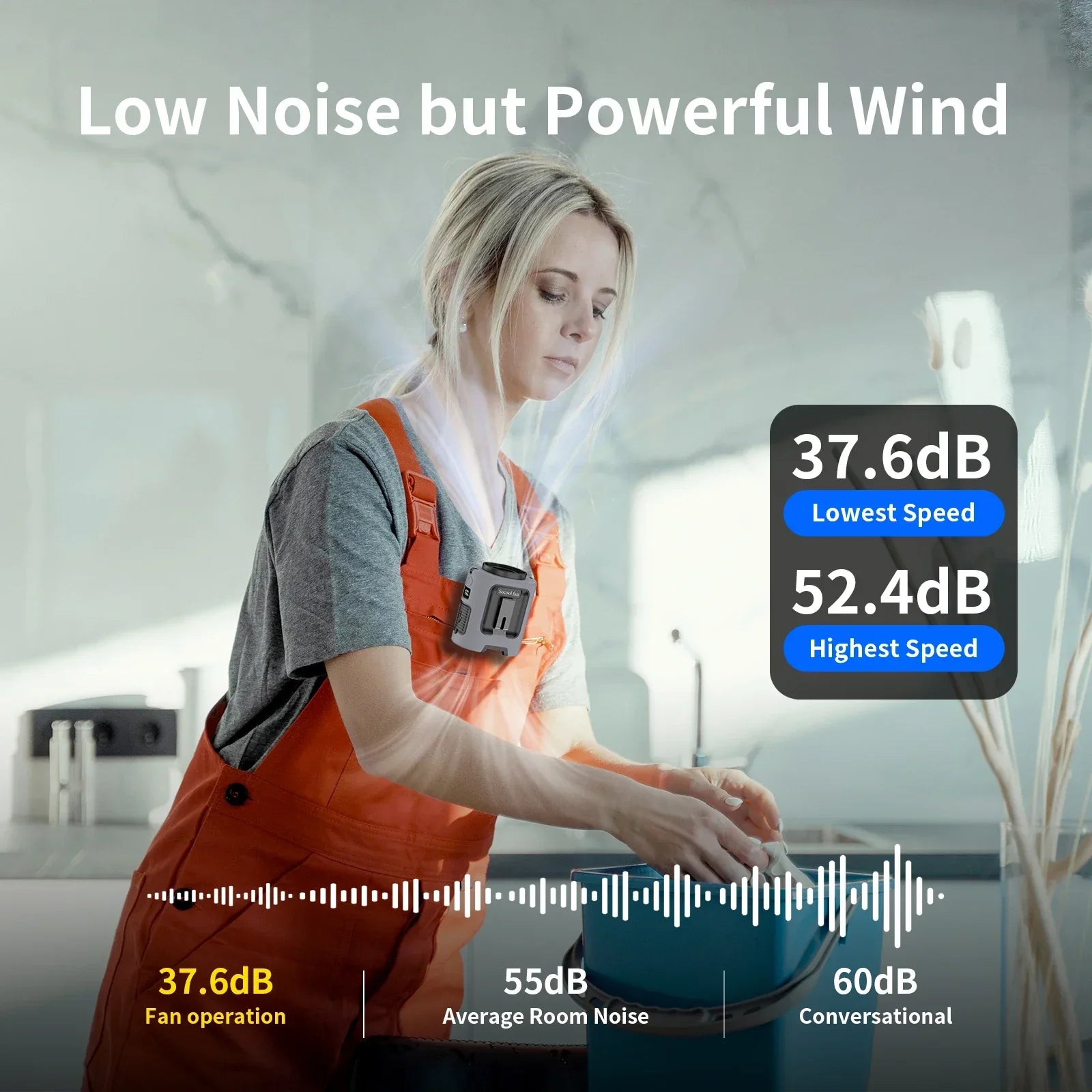 Equipped with a high-speed turbo motor, portable waist fan can reach a maximum speed of 13000RPM, generating airflow of up to 19.69ft/s with an air supply distance of 8.2ft, cooling down in a second. With 4 adjustable wind speed settings, from natural to strong, can be set to various modes based on your needs, making it ideal for construction workers in high-temperature environments.