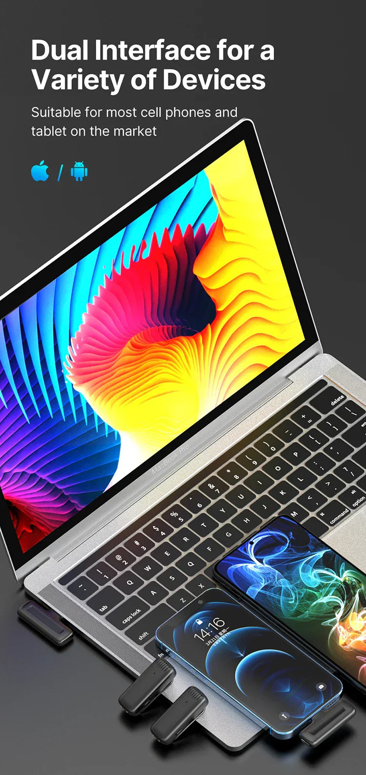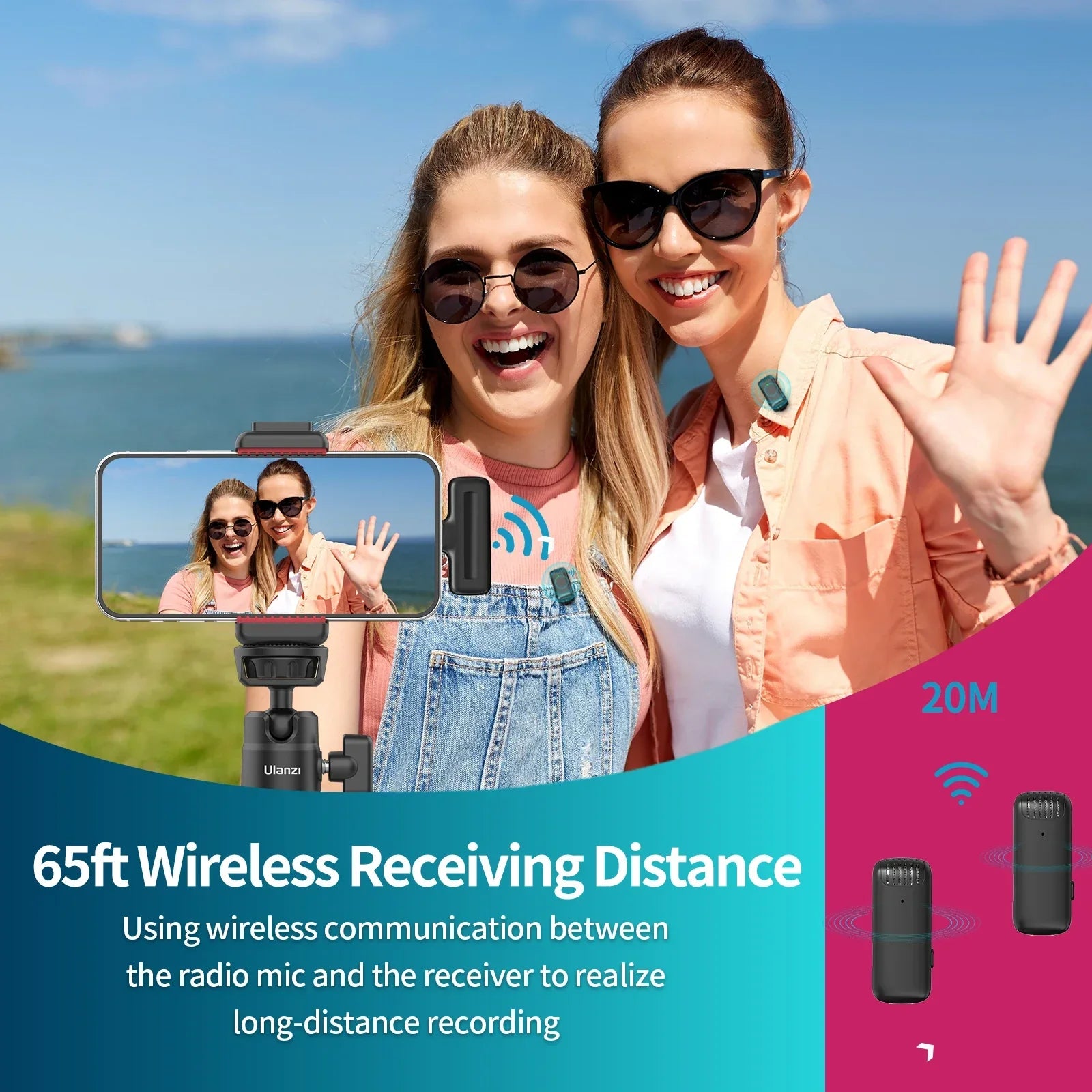 Using wireless communication between the radio mic and the receiver to realize long-distance recording. The longest transmission distance is up to 20 meters/65ft. Also support dual microphone simultaneous recording, which is more widely used