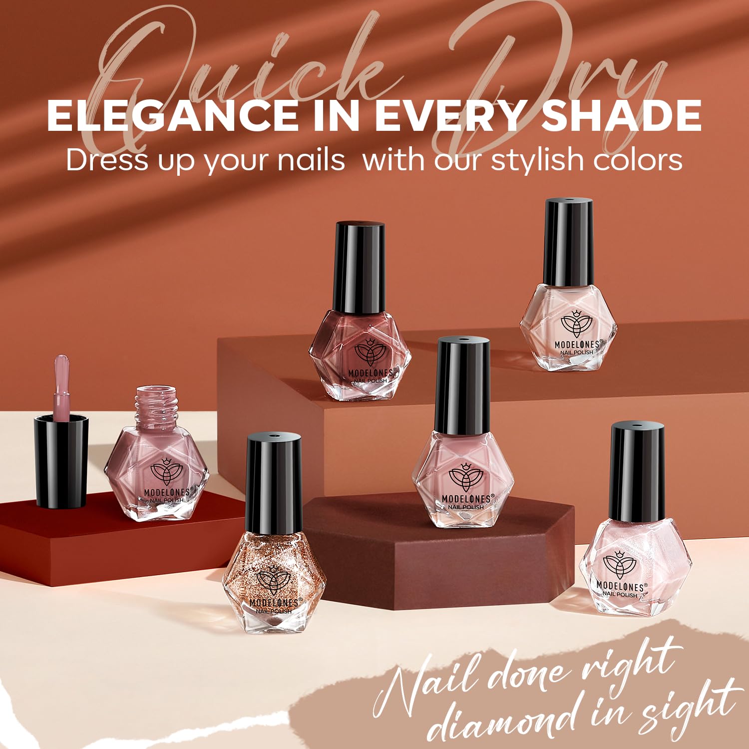 • Enduring Elegance: Feel the elegance of these vintage-inspired nudes: nude, pink nude, and brown nude. A perfect blend of understated beauty and timeless style with modelones 6 colors quick dry nail polish set