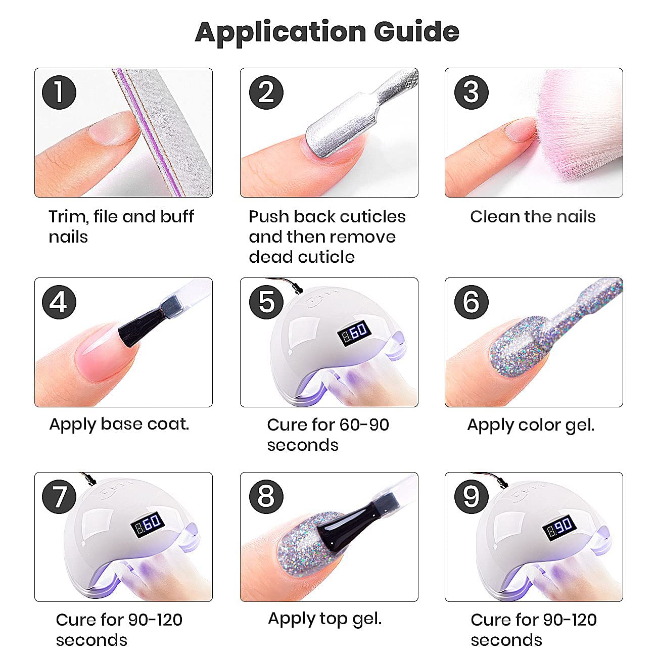 • EASY APPLICATION LONG LASTING: This glitter rainbow gel polish is long lasting for 21 days with perfect shine under proper application. Highly recommend a minimum of 60 seconds with a LED light and 2 minutes with a UV lamp for each layer