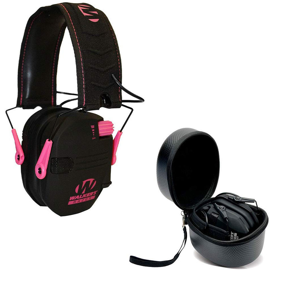 Details: Invest in these Walker's Razor Series Slim Shooter Folding Earmuffs for your hearing's sake. These ear muffs feature 2 omni directional microphones and a noise reduction rating of 23 dB. They also boast full dynamic range HD speakers and a sound activated compression reaction of 0.02 seconds. Enjoy independent volume controls with the recessed control knobs, as well as the audio input jack and comfortable wire frame folding headband. These headphones are powered by 2 included AAA batteries. Safely protect your Walker's Razor ear muffs with this Walker's Razor ear muff carrying case, made from long-lasting durable EVA to withstand your toughest treatment. The shockproof, dustproof, and waterproof design makes it easy to take your Razor muffs on the go with the included hand strap - throw it in a bag or in your truck's glove box and never worry about damaging your muffs again with this sturdy case. An exterior zipper hides your valuable muffs away and keeps them safe, while the interior mesh pocket is perfect for storing away cables, batteries, or other accessories. Featuring a classic black low-profile design and a sewn-in Walker's patch on the front.