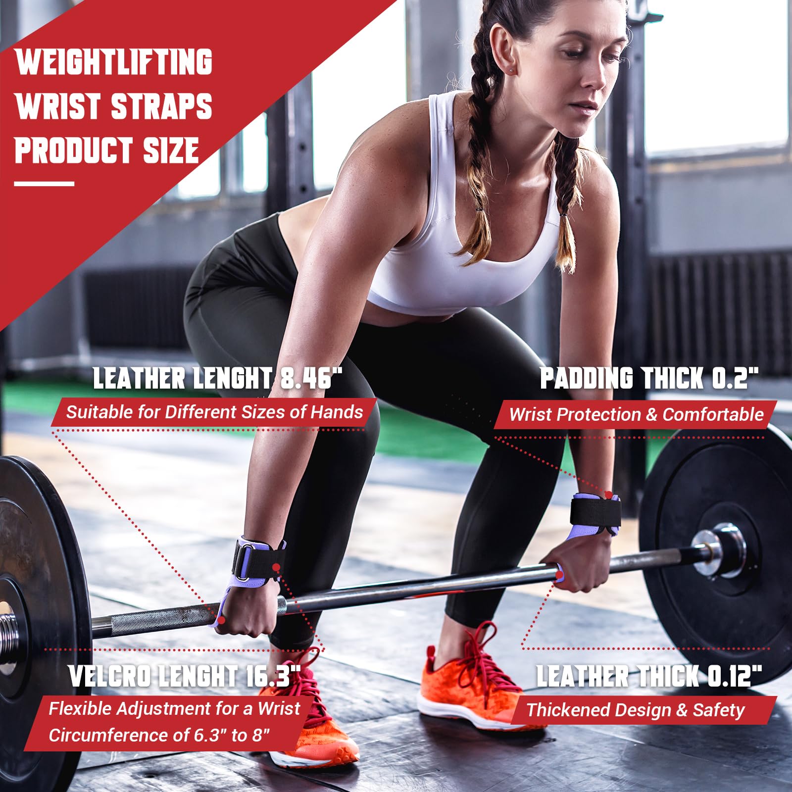 • Perfect Size Weightlifting Wrist Straps: Leather of our gym wrist hooks straps is 8.46 inches long and can fit different size palms. Leather with double layers of sewing design thickness of 0.19 inches, not only soft but also safe and comfortable. The neoprene padding is 7.48 inches long, 2.56 inches wide and 0.2 inches thick to better protect the wrist from injury. The adjustable high-density hook and loop length is 16.7 inches and fits wrist circumferences of 6.3 inches to 8 inches.
