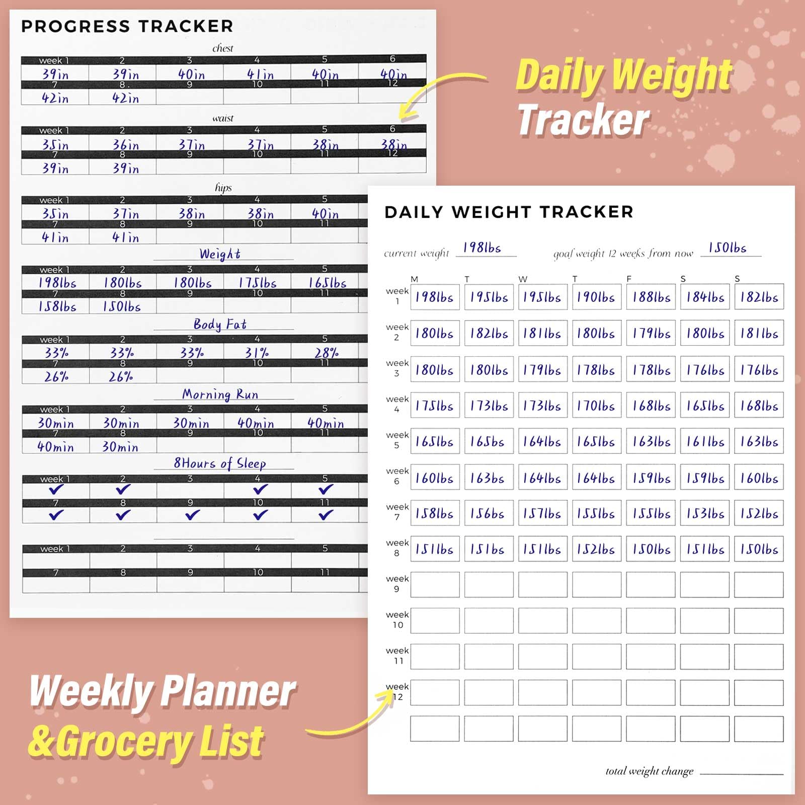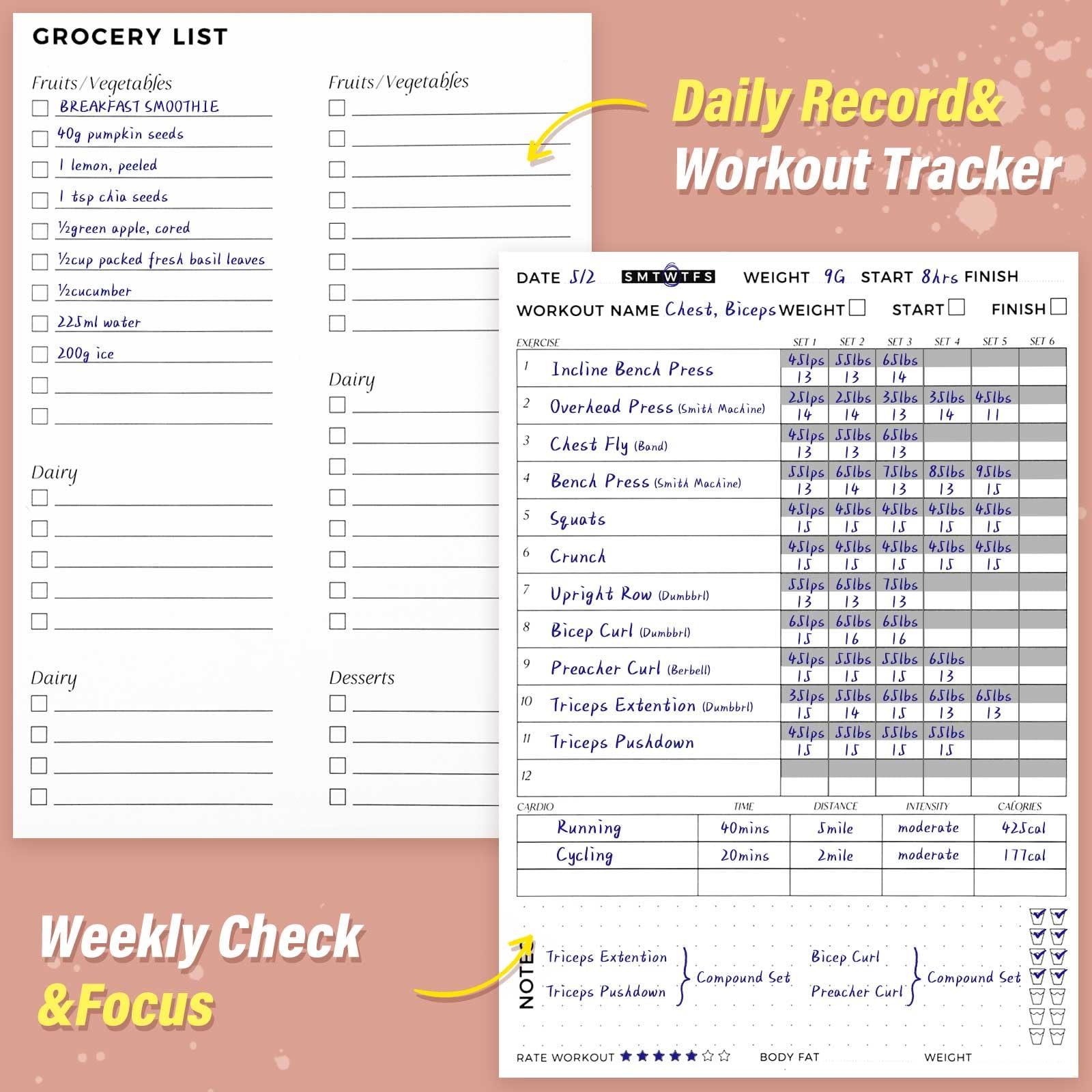 - Overview - This workout journal contains goals and plan, progress tracker, weekly planner, food grocery list, daily exercise, cardio and water page and notes page, that help you record your data and work out then achieve your goals perfectly.