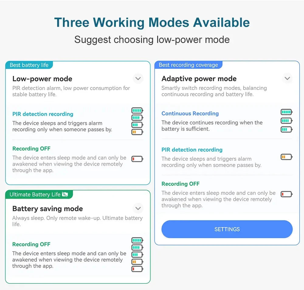 *It's an IP camera with a built-in battery that can use for a few months. Compare with normal IP cameras, the biggest difference is that low-power IP cameras stay in sleeping mode most of the time. It only turns on working mode while the passive infrared sensor detects motion or the user is viewing the video.