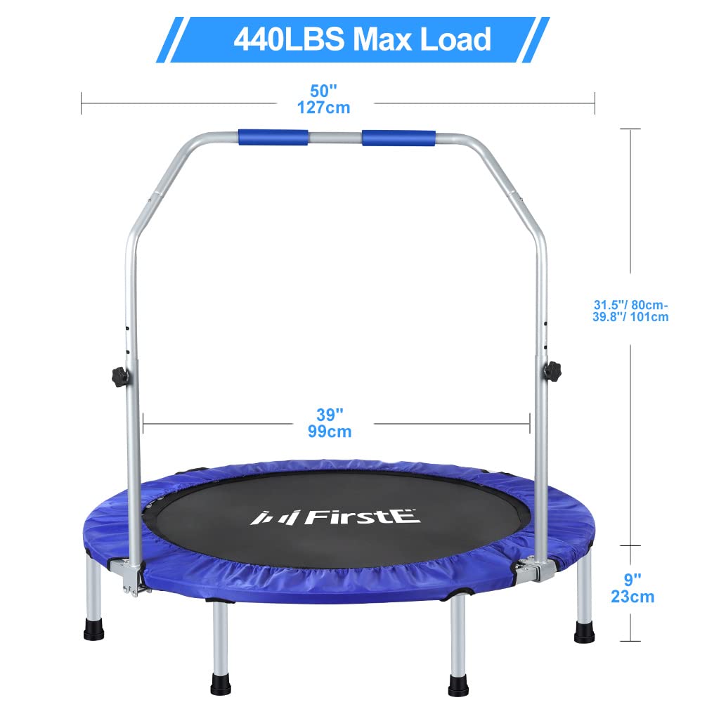 - Sturdy for Max Load 440LBS: FirstE fitness trampolines adopt steel frame, 8 firm legs, heavy-duty stainless steel springs x 40, wear-resistant PP mat which can support up to 440lbs, promise you have a good jumping experience. The 50' bounce mat rebounder trampoline has enough space for exercise