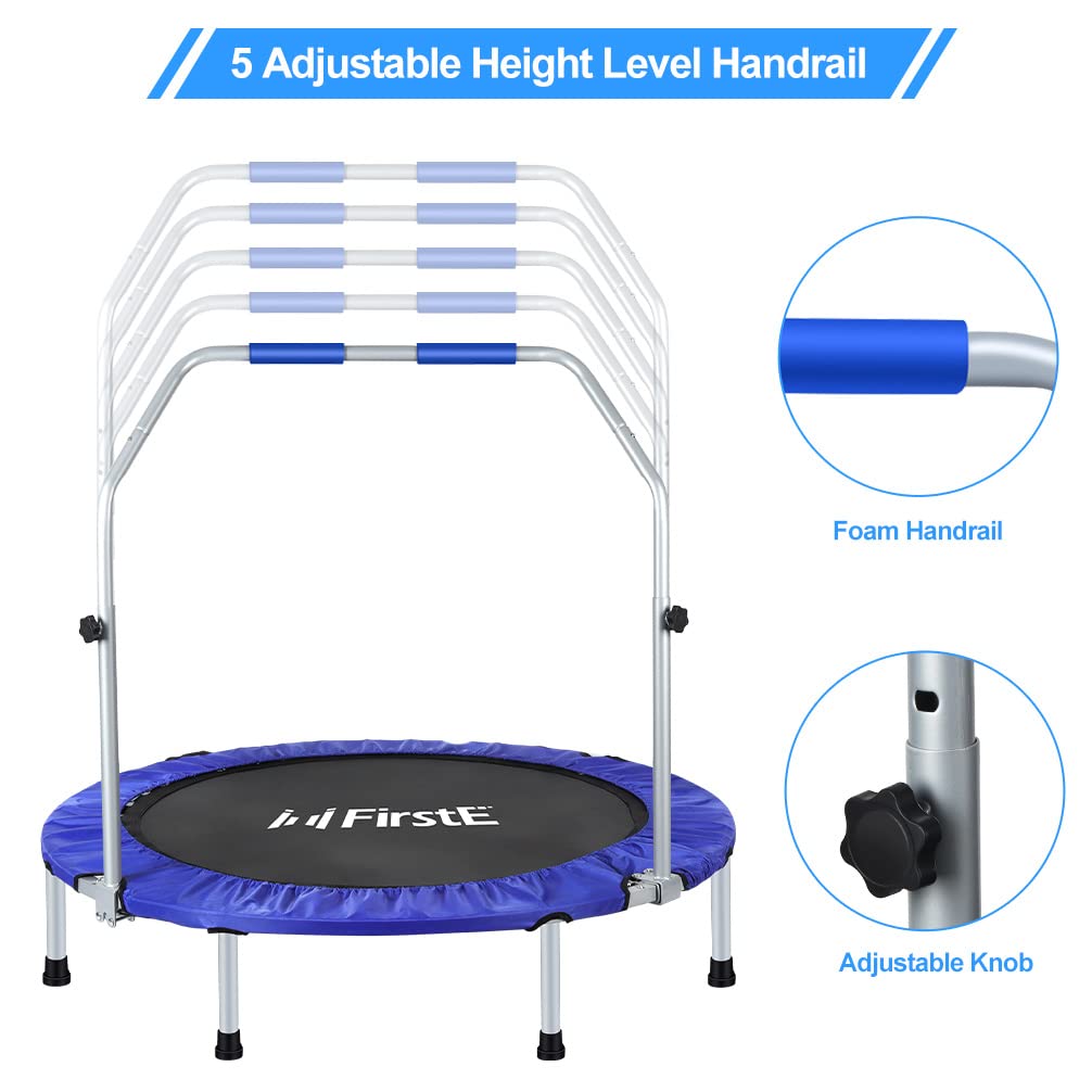 - Safe Adjustable Bar: Our jump trampolines provide five different levels of foam handrail heights( 31.5 inch -39.8 inch), which can be easily adjusted to fit for adults of different heights and ages. Anti-slip, sweat-resistant foam covered adjustable bar makes you more comfortable when grasping