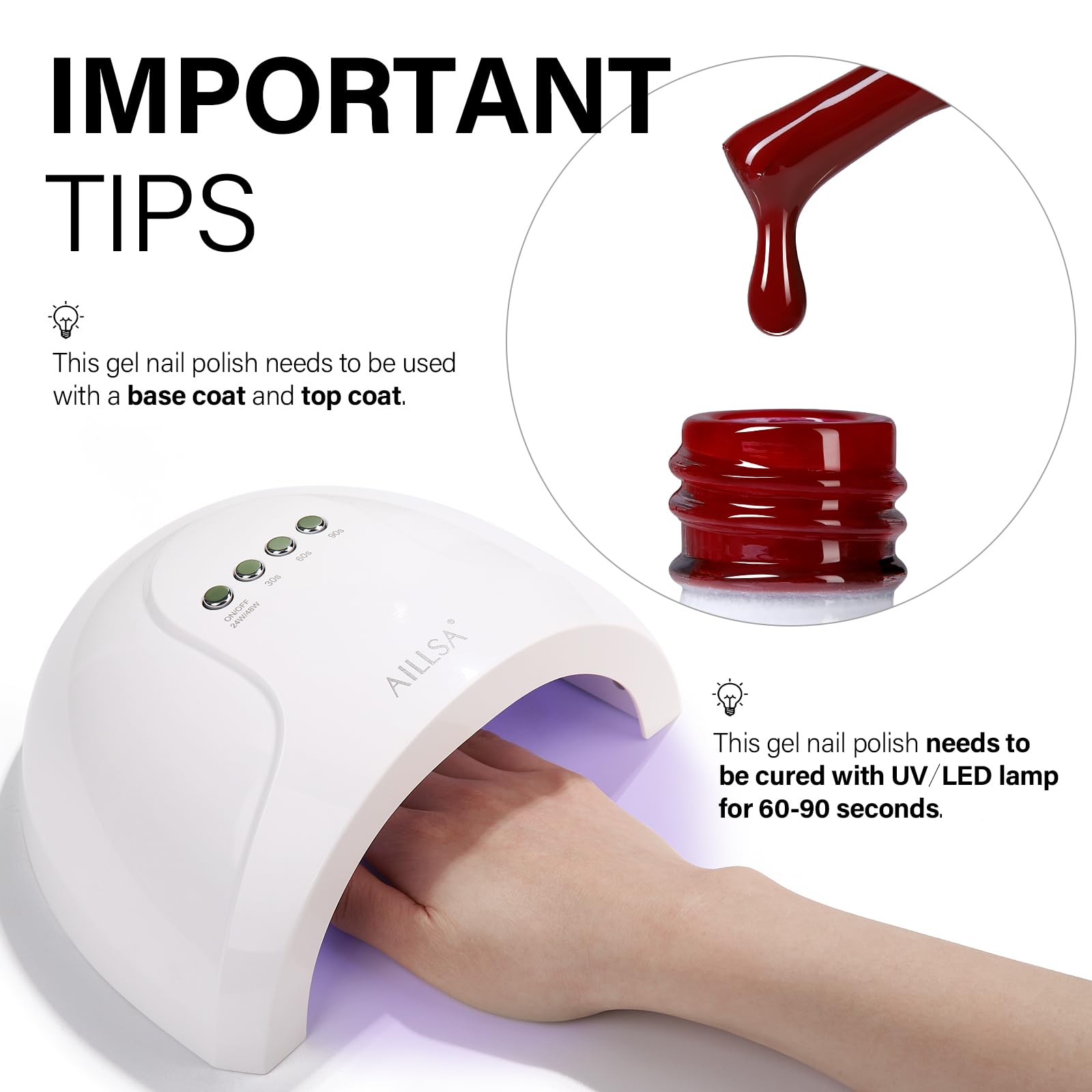 - 【 LONG-LASTING SHINE 】AILLSA carmine burgundy red gel nail polish needs to be cured under L E D/U V light, under the correct use steps, it can last for 21-28 days and keep the shiny luster. You'll never have to worry about your nails peeling off while showering and doing housework. Let AILLSA serve you a longer time!