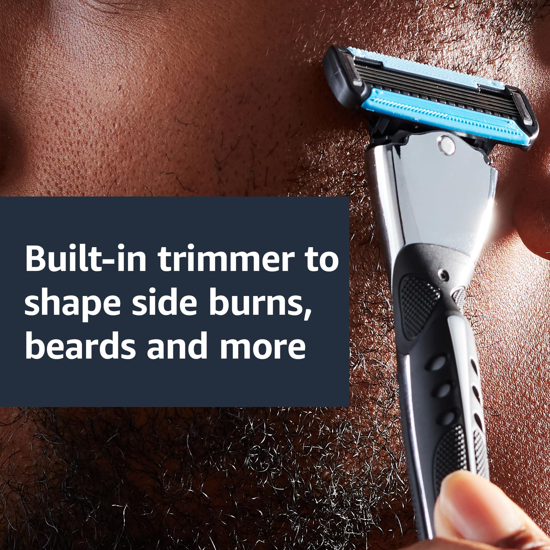 Details: Amazon Basics 5-Blade MotionSphere Razor for Men with Dual Lubrication and Precision Beard Trimmer, Handle & 2 Cartridges (Cartridges fit Amazon Basics Razor Handles only) (Previously Solimo) , Includes one Amazon Basics 5-Blade MotionSphere Razor handle and two refill cartridges and Packaging may vary from images shown. This was previously a Solimo product and is now a part of the Amazon Basics brand. The product is the exact same formulation, size and quality. INSTRUCTIONS: 1. Prepare: Wash your face with warm water to remove dirt and oils. Apply a pre-shave oil (optional). 2. Lather: Apply shaving cream or gel to your face using a brush or directly with your hands. 3. Shave: Use a razor to shave in the direction of hair growth, using short and light strokes, rinsing the razor frequently. For a closer shave, you can reapply shaving cream/gel and shave against the grain (opposite direction of hair growth). However, be cautious as this may increase the risk of skin irritation or ingrown hairs. 4. Soothe: Rinse your face, pat dry, and apply an aftershave lotion or balm to moisturize and soothe the skin. 5. Store: Shake off excess water after use and store your razor in a clean, dry place.