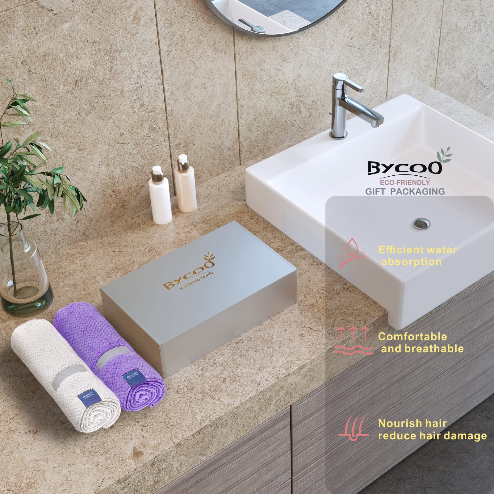 - FAMILY FRIENDLY - Our microfiber materials have a longer life, less pollution, less consumption, and less waste.Suitable for family travel, gym, yoga, camping, spa. Wrap your little ones with a BYCOO towel after a bath, shower, or beach time. Give our microfiber hair towels a gift for your beloved ones, for your wife, mom, child, friends, yourself.