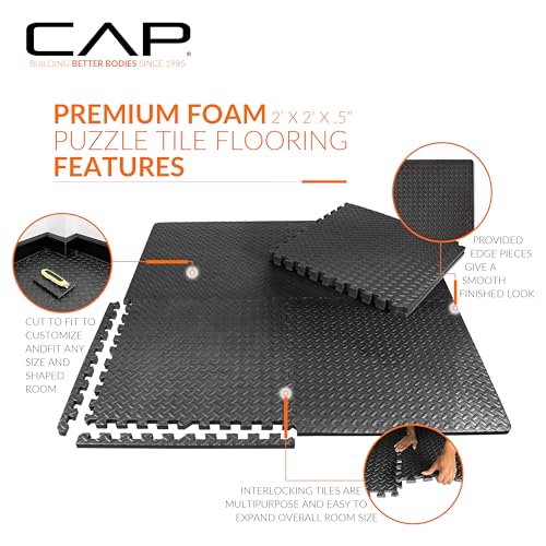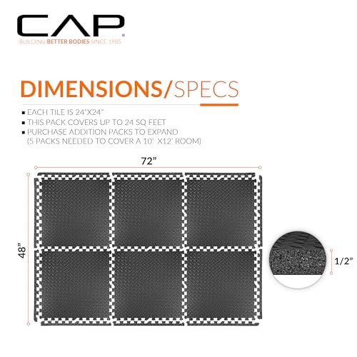 Details: The CAP Puzzle Exercise Mat 24' x 24' x 1/2' features SIX interlocking heavy-duty foam tiles with finished edges. Each tile measures 24” length by 24” width by 0.5” height and is crafted from high-density foam with a diamond textured pattern in black. When all 6-pieces are assembled, the mat covers a 24 square foot surface area. The high-density foam is shock-absorbing, waterproof, and has a firm yet soft surface. The high-density foam helps to reduce impact on your joints and protect your flooring. This puzzle exercise mat is ideal for home gyms or exercise equipment.