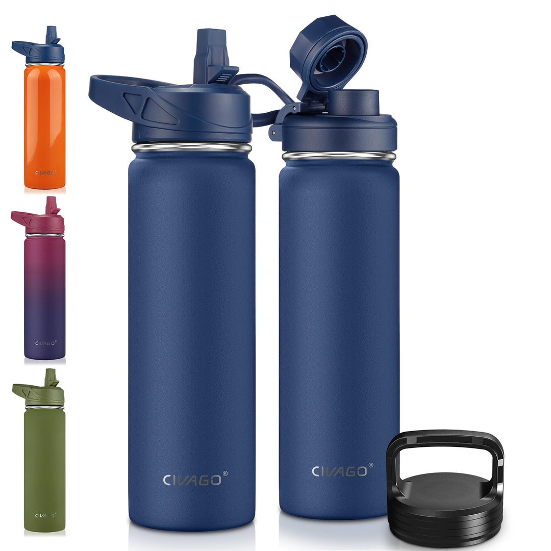 CIVAGO 22 oz Insulated Water Bottle With Straw, Stainless Steel Sports Water Flask Cup with 3 Lids (Straw, Portable Spout and Handle Lid), Double Walled Travel Thermal Canteen Mug, Navy Blue