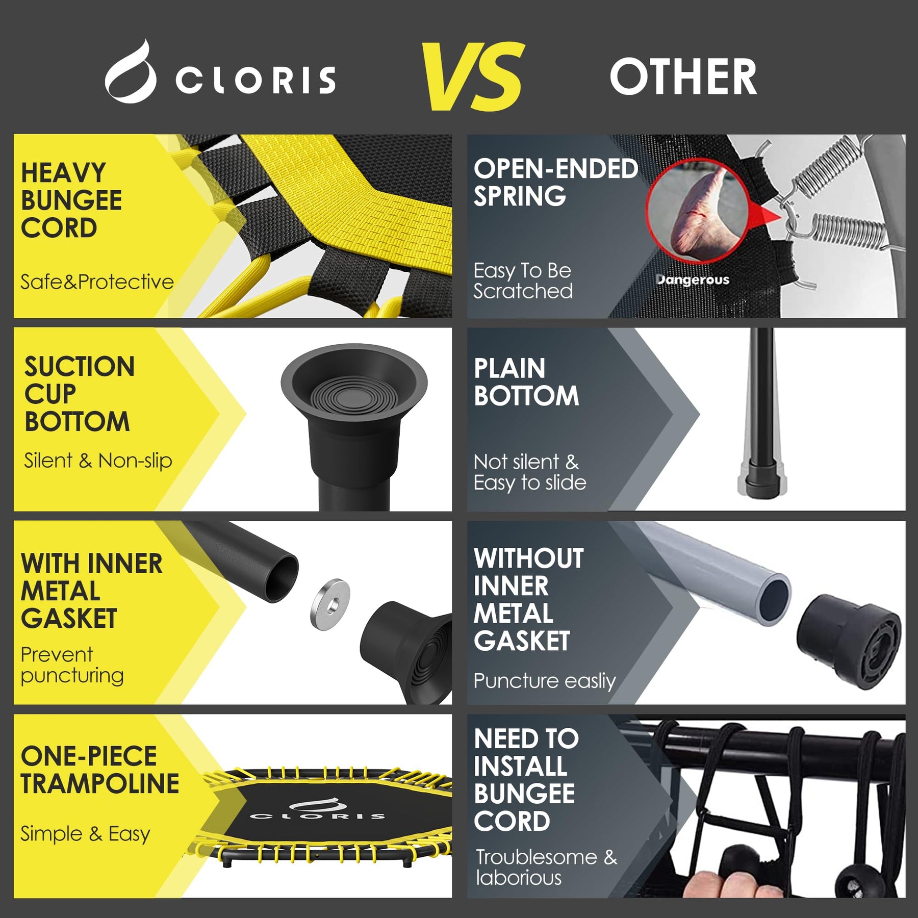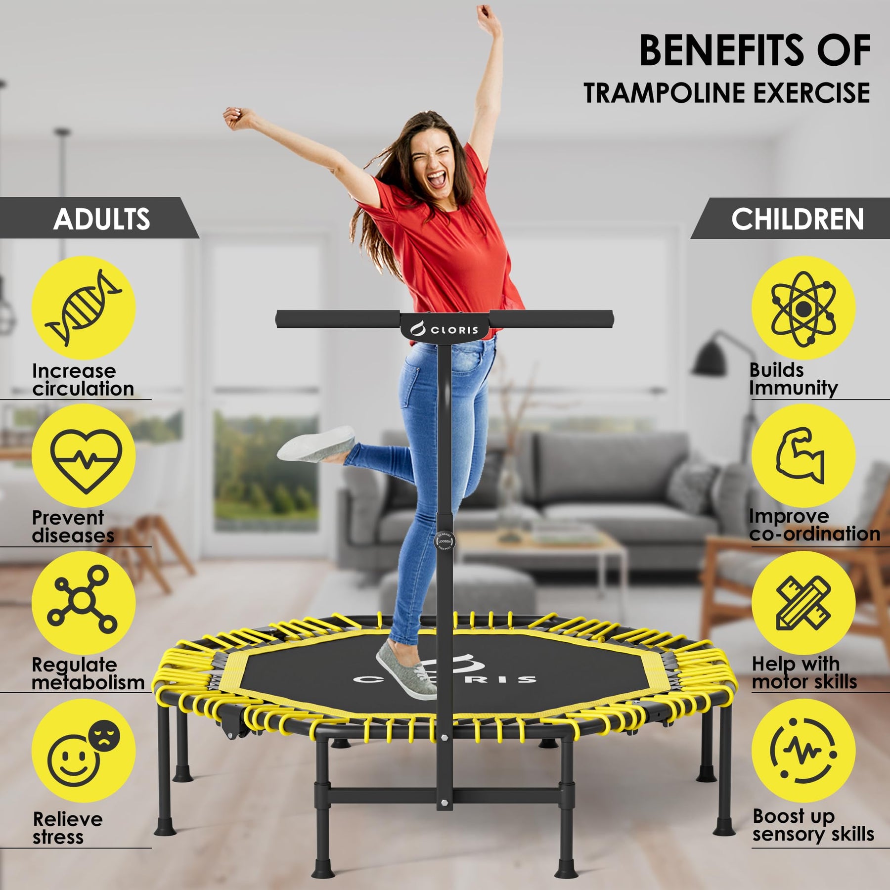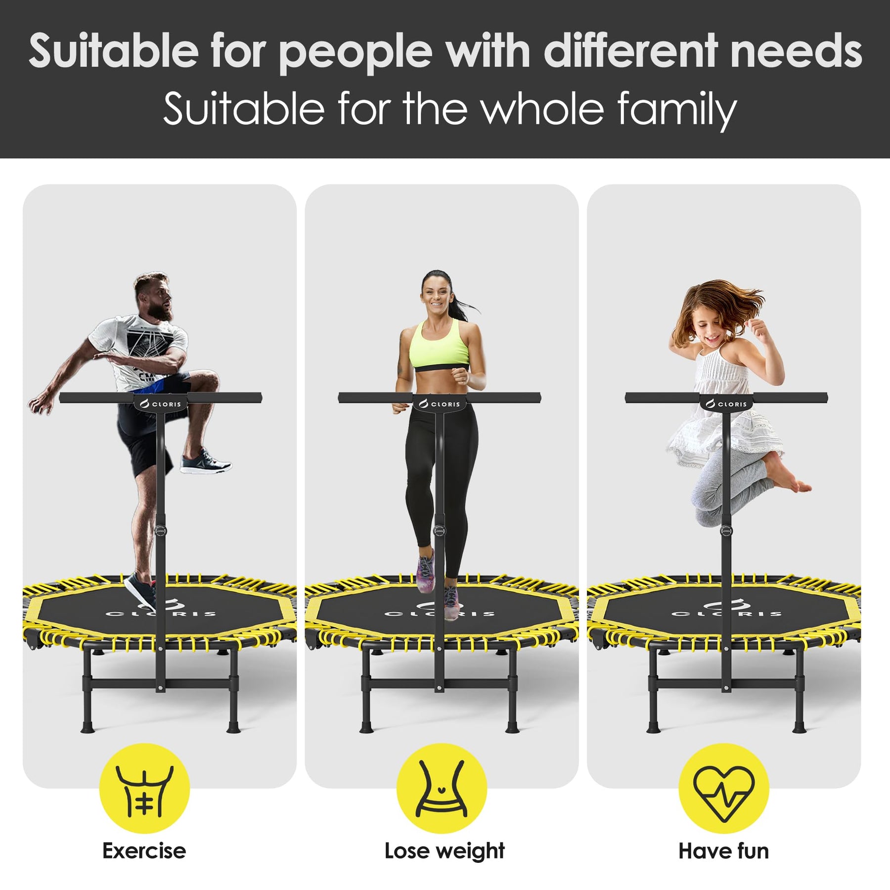 • ✅[SAFE AND FUN] The padded handlebar is adjustable ,which fits people's height perfectly. People can use the handlebar for easy grip to control their bounce. This springless trampoline is safer than the spring rebounders, primarily due to more soft parts. There is less of a chance of experiencing pinched fingers or toes, regardless of the safety precautions in place. Moreover, this trampoline has been added with a covering on top of the bands to provide safer jump pad surface.