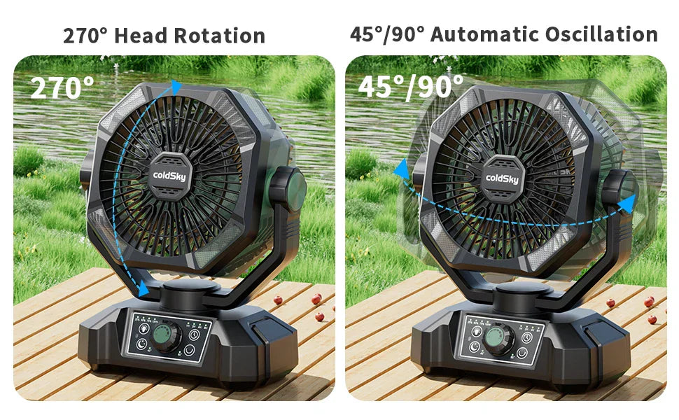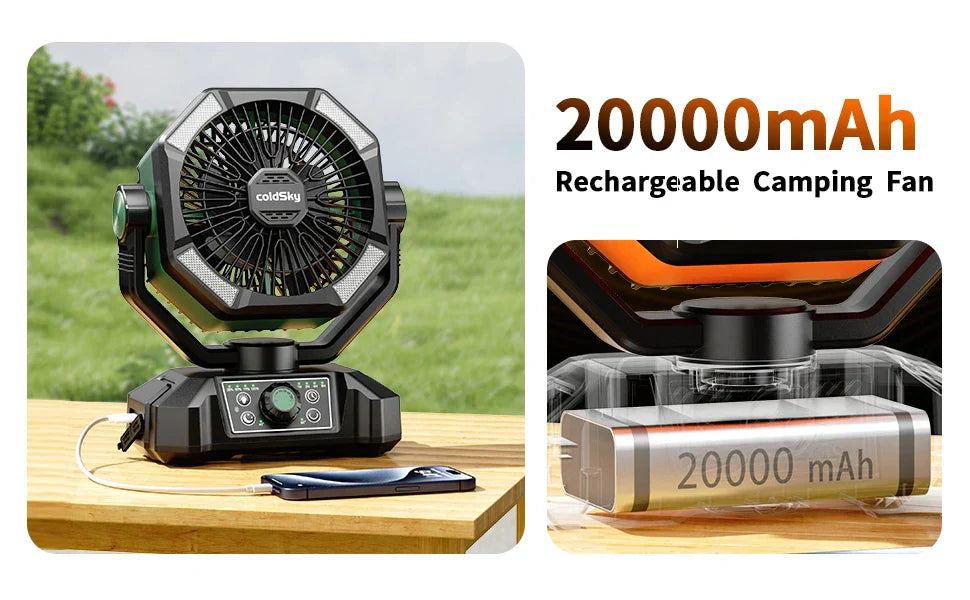 coldSky battery operated fan features a powerful 20000mAh rechargeable battery. At its lowest speed, it can run continuously for over 40-50 hours on a full charge. Never worry about running out of battery during outdoor camping, travel, hurricanes, or power outages. It also comes with USB-A and USB-C dual charging ports, providing emergency charging for your electronic devices or camping tools outdoors