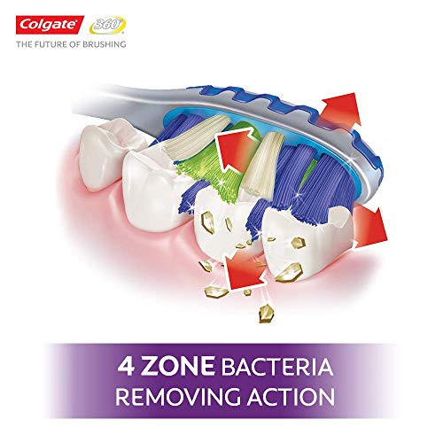 Details: Teeth. Tongue. Cheeks. Gums. 4 Zone (Helps removes bacteria from teeth, tongue, cheeks, and gums) bacteria removing action. Whole mouth clean. Working towards a zero waste future. Cleans: Teeth, Tongue, Cheeks, Gums. Advanced multi-action bristle design (vs. an ordinary flat trim toothbrush). Dentists & Hygienists recommend replacing your toothbrush every 3 months. www.colgate.com. Questions? 1-800-468-6502. www.colgate360.com. Save water. www.colgate.com. Made in Switzerland.