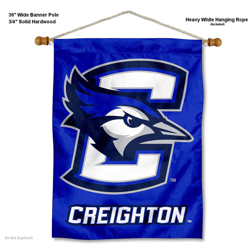 Details: Creighton University Banner Flag and Wood Banner Pole Set includes a large 30x40 inch college banner which is made of thick double sided 2-ply Polyester with sewn-in liner, includes a 36 inch wide hardwood and 3/4 inch diameter banner pole, and offers solid wood finial ends and thick white hanging cord. These 'Ready to Display' no tools needed wall banners are Officially Licensed and University and College Approved and the double sided screen printed logos are viewable and readable correctly on both sides. The removable banner pole can fit sleeved banner flags up to 30 inches wide.