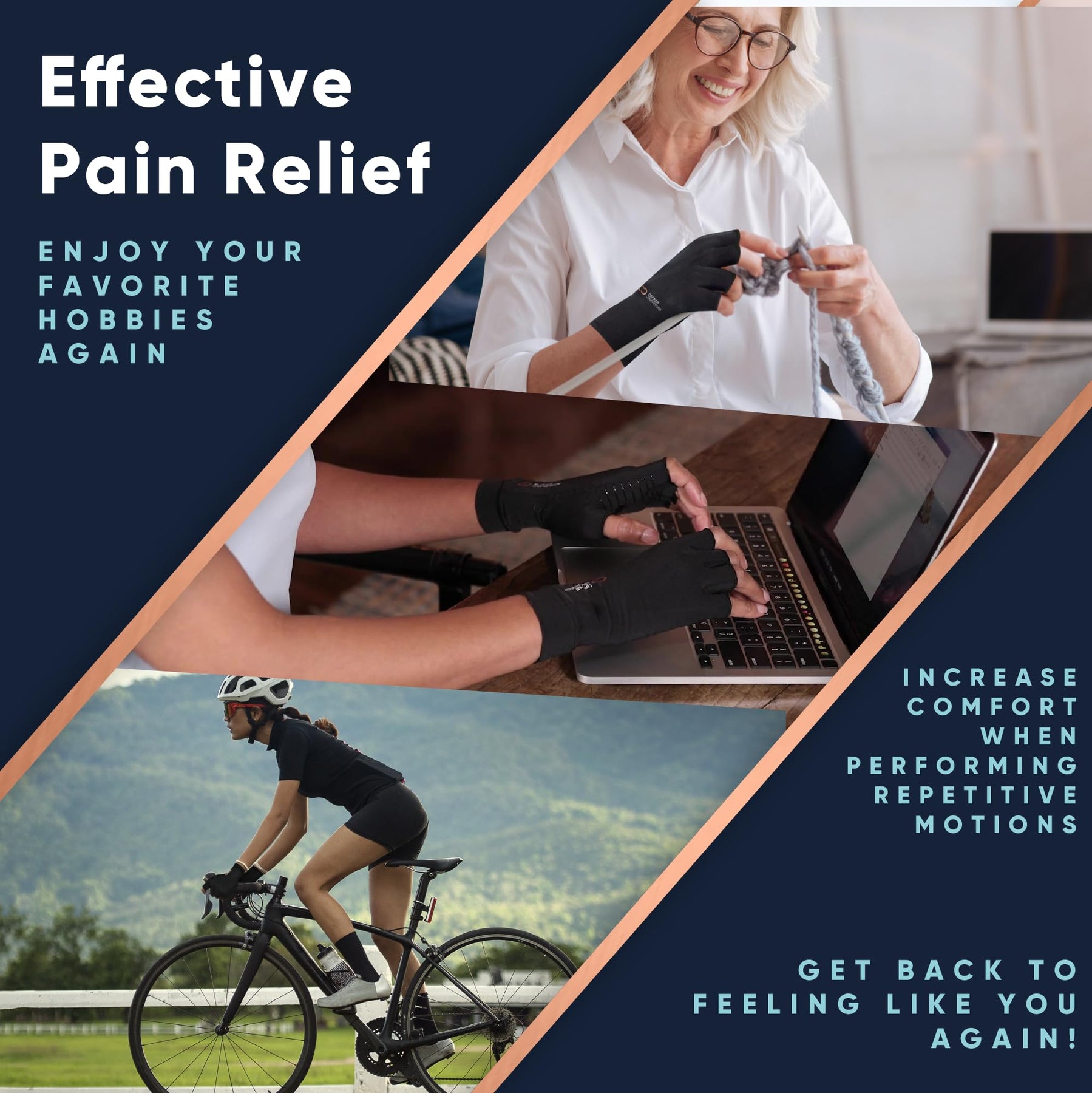 • FIND THE STRENGTH TO HEAL. Copper Compression's Arthritis Gloves provide you with the compression you need to help reduce swelling and pressure, increase blood flow, restrict excess fluid build-up, and relieve aching and soreness in joints. The therapeutic value of these fingerless gloves provides support in managing medical conditions such as: arthritis, carpal tunnel, tendonitis, typing, texting, purlicue pain and repetitive stress injuries.