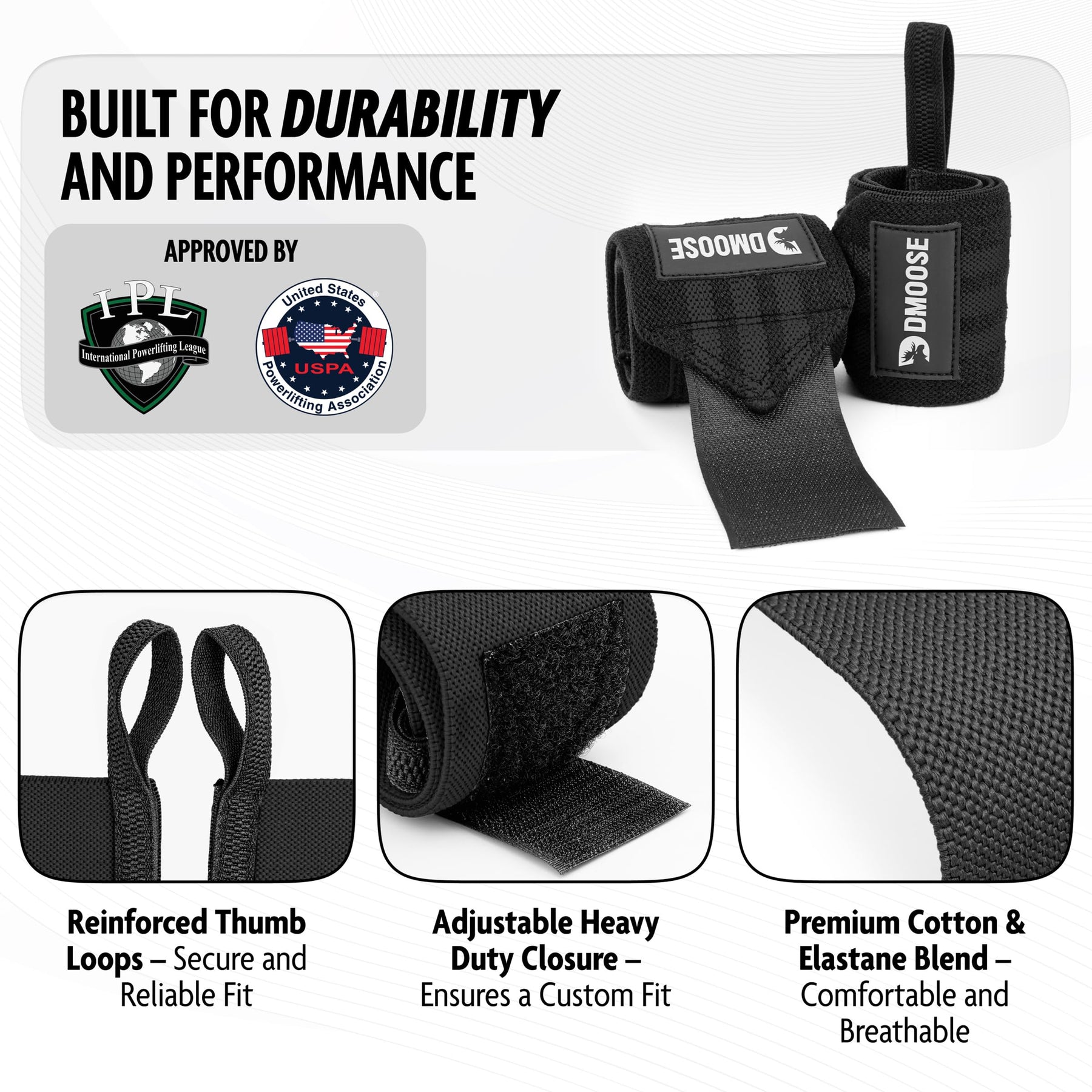 - ππππππππ πππππ πππππππ π ππ πππππ πππ ππ: Keep your wrists stable during heavy lifts with DMoose Wrist Straps for Weightlifting. Designed for reliable support, maintain proper wrist alignment, reducing strain and injury risk. Ideal for bench presses, overhead presses, and deadlifts, these weight lifting wrist wraps offer the stability you need to lift confidently. Plus they are USPA & IPL approved, making them perfect for competitive lifting and serious training.